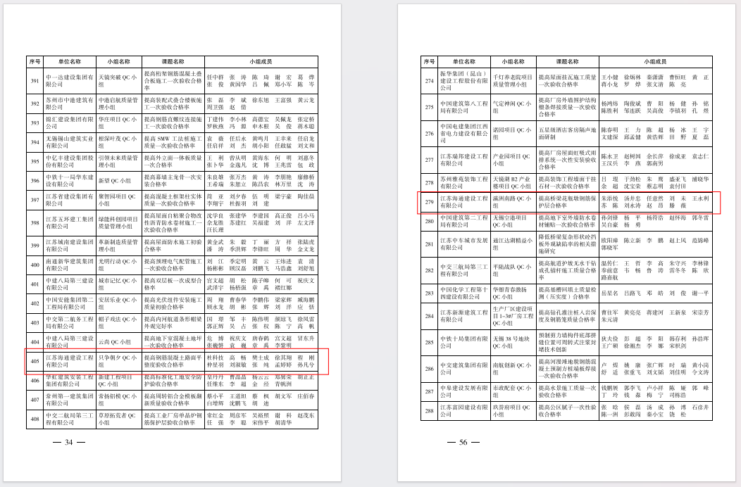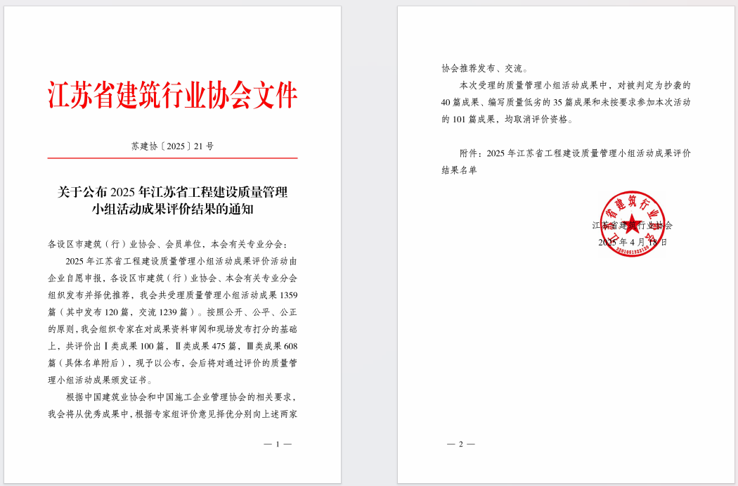 近日,江蘇省建筑行業(yè)協(xié)會(huì)公布2025年江蘇省工程建設(shè)質(zhì)量管理小組活動(dòng)成果評(píng)價(jià)結(jié)果,海建公司“只爭朝夕”QC小組、“瀛洲南路”QC小組憑借成果《提高鋼筋混凝土路面平整度驗(yàn)收合格率》及《提高橋梁花瓶墩鋼筋保護(hù)層合格率》,在眾多參賽小組中脫穎而出,分別榮獲二類、三類成果獎(jiǎng)。