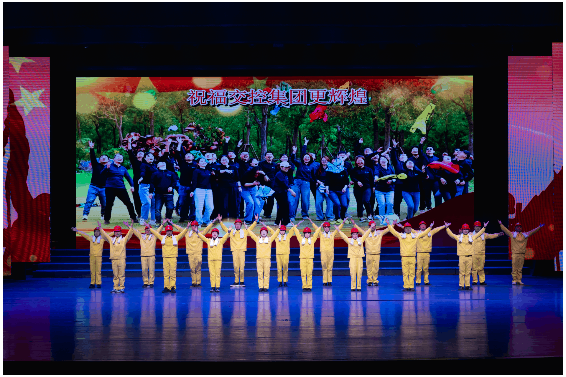精彩節(jié)目的不斷呈現(xiàn),使現(xiàn)場氣氛不斷升溫,掌聲、歡呼聲高潮迭起。最后,文藝匯演在歌舞《黨旗飄揚(yáng)的方向》中圓滿落幕。集團(tuán)領(lǐng)導(dǎo)與全體演職人員上臺(tái)合影留念,定格這珍貴瞬間。