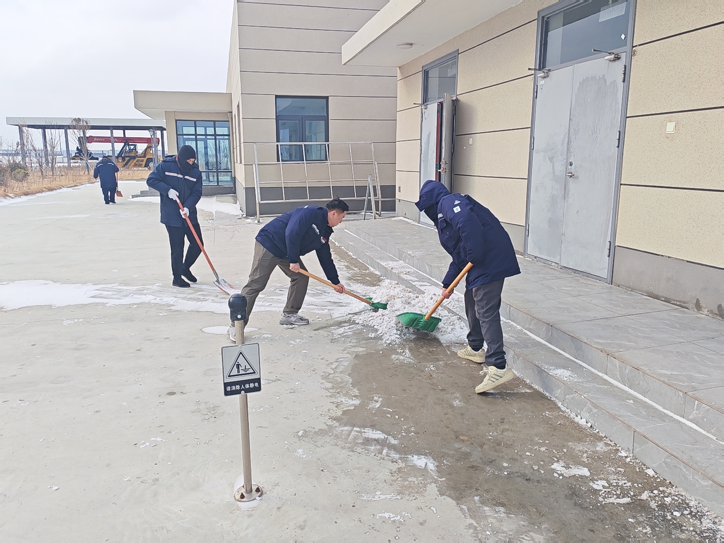面對路面結(jié)冰、積雪覆蓋的情況,公司領(lǐng)導班組提前部署,第一時間組織人員開展場站及堆場的除雪作業(yè)。通過布撒融雪劑,使用鐵鍬、雪鏟、掃帚等除冰除雪工具,對辦公樓周邊、主干道及關(guān)鍵作業(yè)區(qū)域的積雪和冰層進行集中清理,有效消除了人員行走與車輛通行的安全隱患。