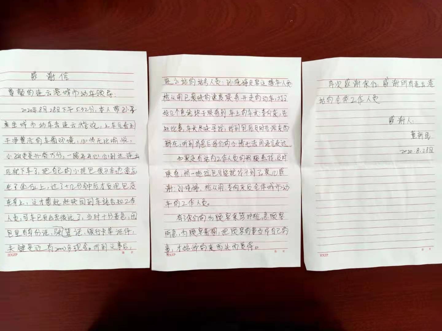 8月28日下午,一位大爺帶著孫子乘坐城市動(dòng)車(chē)去連云景區(qū)游玩。新穎獨(dú)特、舒適整潔的車(chē)廂一下吸引了小朋友的注意力,小朋友興奮萬(wàn)分,大爺也感嘆城市的發(fā)展速度并由衷的高興,以至于到達(dá)連云站下車(chē)時(shí),把小掛包丟在了車(chē)上。過(guò)了十幾分鐘后,才發(fā)現(xiàn)包沒(méi)在身上,大爺立馬趕回車(chē)站向工作人員尋求幫助??墒钱?dāng)時(shí)車(chē)已經(jīng)發(fā)車(chē)走了,大爺十分著急,因?yàn)榘镉猩矸葑C、駕駛證、銀行卡等重要證件,還有2000多元現(xiàn)金。得知情況后,連云站值班站長(zhǎng)孫曉婷及客運(yùn)接車(chē)人員杭從明緊忙聯(lián)系當(dāng)班列車(chē)長(zhǎng)李向東。得知此事后,列車(chē)長(zhǎng)立馬尋找掛包,座椅的邊邊角角都找了一遍,果然在后排座位上找到了掛包。他立刻聯(lián)系站務(wù)員告知包已經(jīng)找到,聽(tīng)到這個(gè)好消息后,大爺懸著的心終于落地了,高興地說(shuō)“謝謝你們所有工作人員,如果不是你們的熱心幫助,我的包也不會(huì)在這么短的時(shí)間內(nèi)找到!”站務(wù)員及客運(yùn)接車(chē)員連忙回道:“這都是我們應(yīng)該做的,能幫助到您是我們最大的快樂(lè)?!?/span>