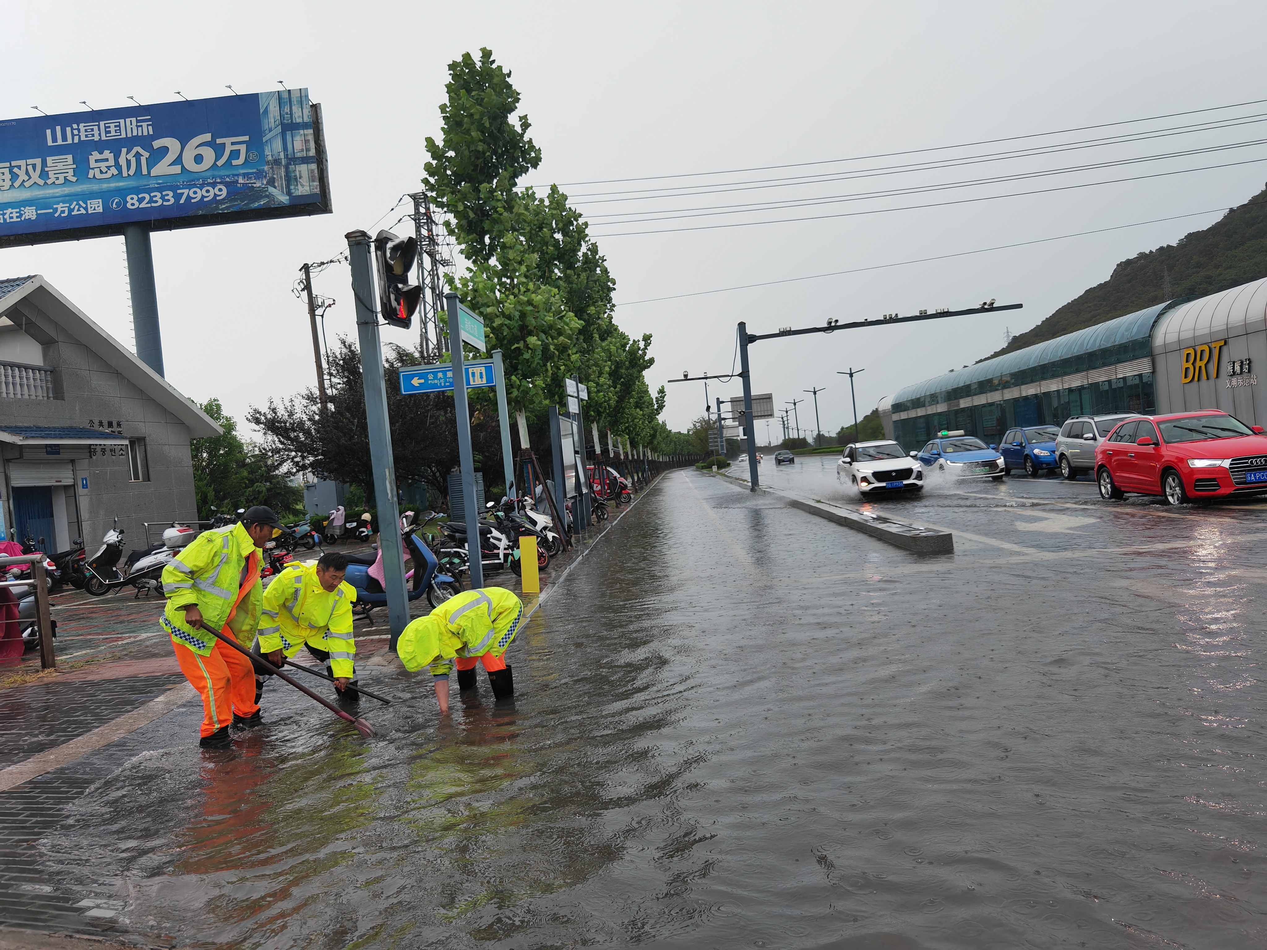 臺風來臨前,豐達公司對管養(yǎng)路段進行全面隱患排查,重點檢查排水系統(tǒng)、泵站運行及施工現(xiàn)場安全,并提前調配應急物資和設備。暴雨來襲后,公司立即按照預案要求,組織150余名應急搶險隊員、14臺應急車輛、3套發(fā)電機組、8臺污水泵及800米水帶等搶險力量,迅速開展道路巡查和險情處置工作。