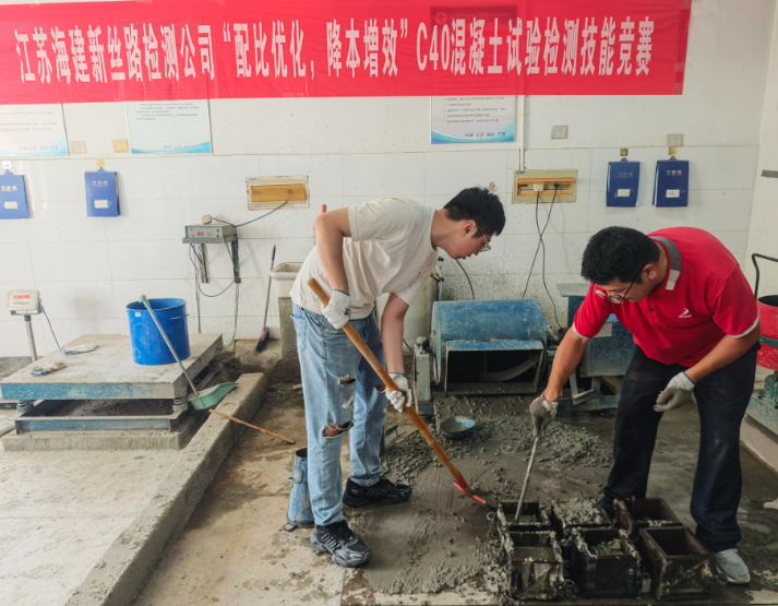 當前,C40混凝土“配比優(yōu)化、降本增效”技能競賽正在江蘇海建新絲路檢測公司順利開展。這場以提升混凝土配比技術、實現降本增效為目標的競賽,吸引公司各科室技術骨干積極參與,目前各項比拼環(huán)節(jié)正有序推進。
