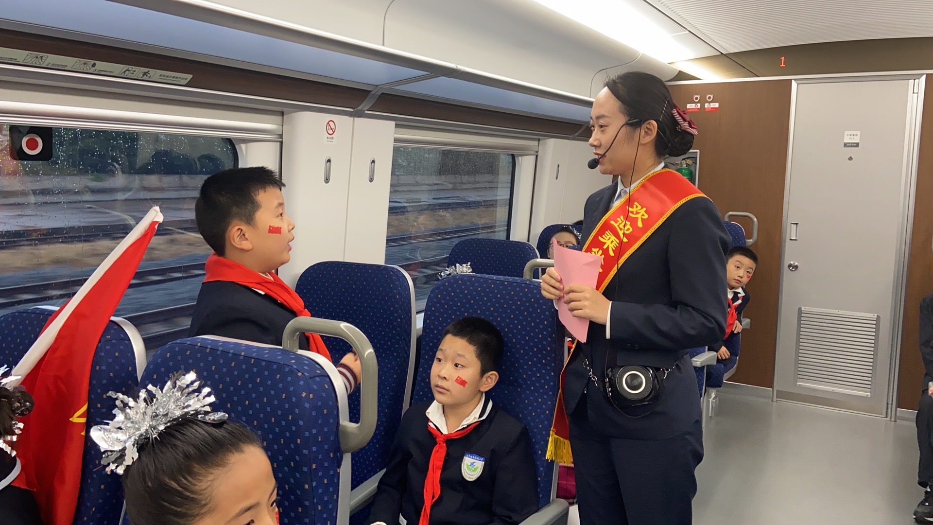 10月15日下午,院前小學(xué)“紅領(lǐng)巾巡訪隊(duì)”的隊(duì)員們,在老師的組織帶領(lǐng)下來(lái)到城市動(dòng)車連云站乘坐S3108次列車,小隊(duì)員們情緒十分激動(dòng),臉頰的左側(cè)還貼著鮮亮的“五星紅旗”,他們著裝統(tǒng)一,精神抖擻,整齊有序的跟隨著城市動(dòng)車的工作人員走進(jìn)了車廂。