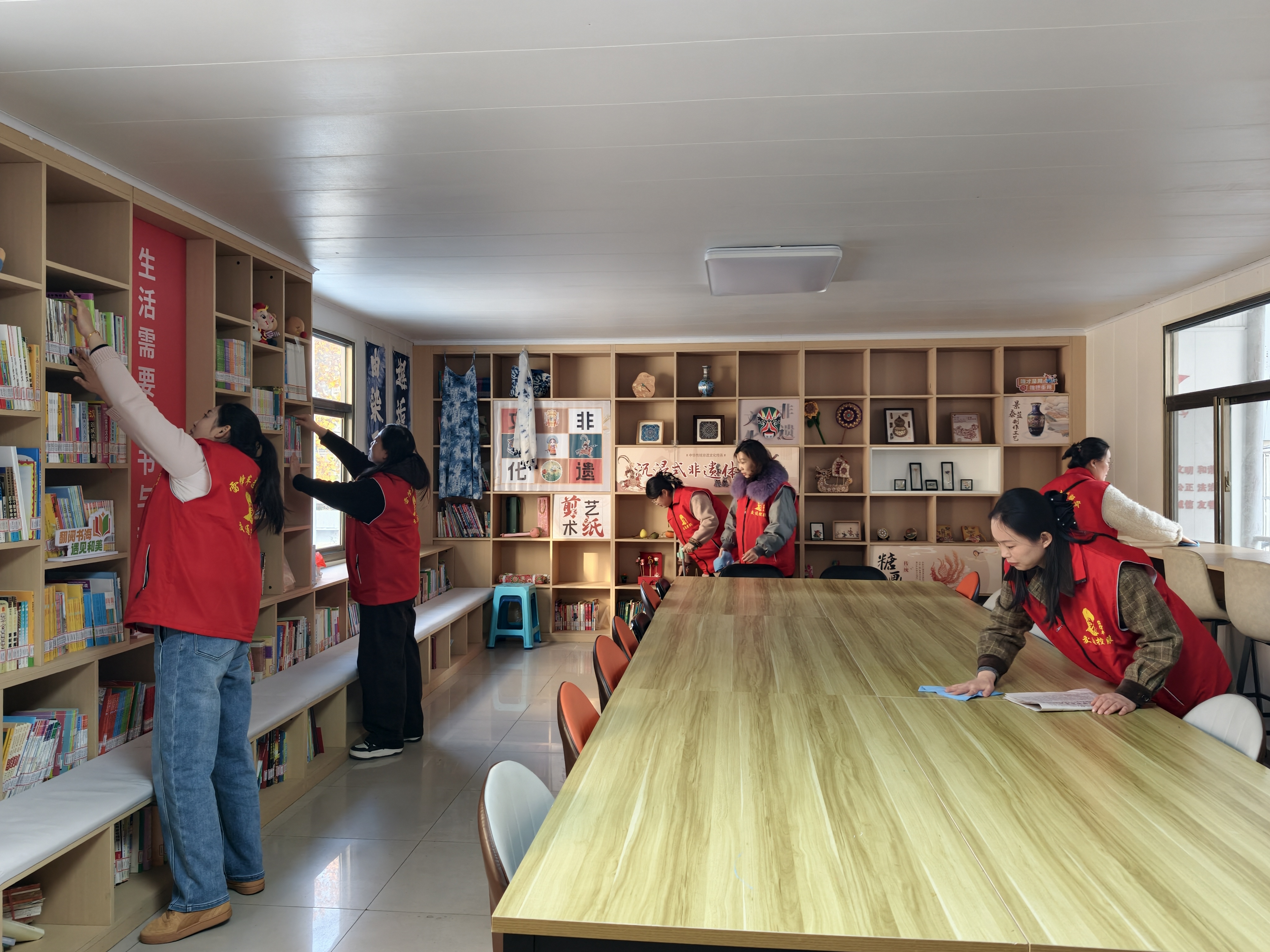 活動當(dāng)天,志愿者們身著統(tǒng)一志愿服裝,攜帶掃帚、抹布、消毒液等清潔工具,迅速投入到各個服務(wù)點位。在殘疾人之家與輔助性就業(yè)室,志愿者們細(xì)心擦拭桌椅、整理康復(fù)器材與就業(yè)工具,清理地面雜物與衛(wèi)生死角,對高頻接觸區(qū)域進(jìn)行消毒消殺,為殘疾人群體營造安全、整潔、舒適的活動與就業(yè)環(huán)境。在樂齡圖書室,大家有序整理書架上的書籍報刊,按類別進(jìn)行分類歸置,擦拭書架灰塵、清掃地面碎屑,讓老年朋友們能在清爽整潔的環(huán)境中享受閱讀樂趣。