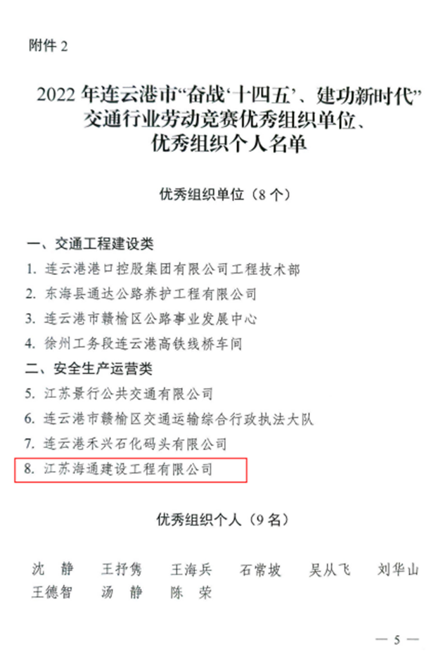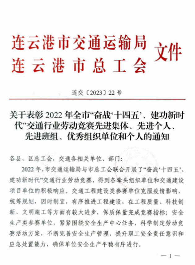 近日,從市總工會、市交通運輸局傳來喜訊,集團權(quán)屬公交集團公交事業(yè)一部榮獲2022年全市“奮戰(zhàn)十四五、建功新時代”交通行業(yè)勞動競賽先進集體,海建公司402省道贛榆南環(huán)段工程橋梁班組、汽車公司?;否{駛一班、明茂新能源公司一線運維班組和豐達公司市區(qū)養(yǎng)護分公司道路施工項目部四個班組榮獲先進班組,公交集團周卓文被評為先進個人,海建公司被評為優(yōu)秀組織單位。