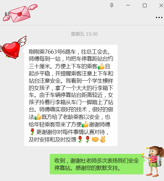 10月24日下午三點,市民杜老先生乘坐6路公交車前往市總工會時,被駕駛員武傳斌的細心服務深深打動。他特意發(fā)消息至公交集團權屬海通公交公司一名職工的手機上,稱贊道:“這位師傅開車特別穩(wěn),每到一站都會將車停得離站臺特別近,上下車方便又安全!”
