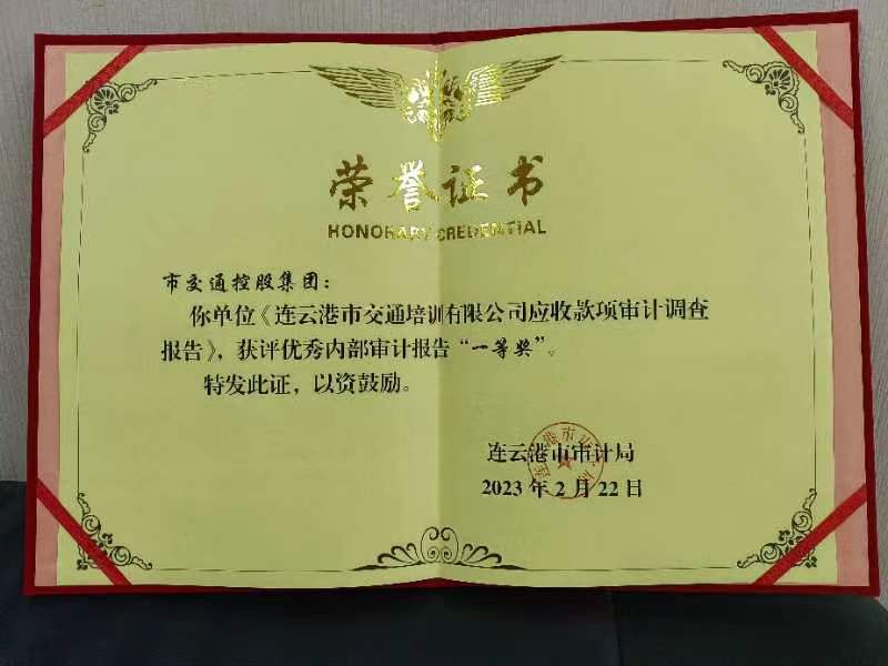 日前,集團(tuán)在市審計(jì)局舉辦的2022年度全市內(nèi)部審計(jì)工作評(píng)比中獲評(píng)“先進(jìn)單位”。集團(tuán)審計(jì)部報(bào)送《連云港市交通培訓(xùn)有限公司應(yīng)收款項(xiàng)審計(jì)調(diào)查報(bào)告》獲評(píng)優(yōu)秀內(nèi)部審計(jì)報(bào)告“一等獎(jiǎng)”。